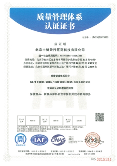 2023年11月20日,北京中健天行醫(yī)藥科技有限公司順利通過ISO9001質(zhì)量管理體系認(rèn)證,認(rèn)證范圍為保健食品、新食品原料研發(fā)申報(bào)兩大主營業(yè)務(wù),成為北京地區(qū)率先獲得該認(rèn)證的研發(fā)申報(bào)服務(wù)商。