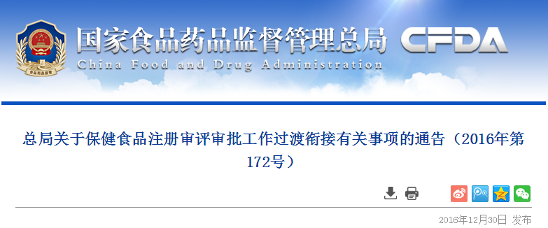 2016年11月15日,國(guó)家食品藥品監(jiān)督管理總局印發(fā)了《保健食品注冊(cè)審評(píng)審批工作細(xì)則(2016版)》(以下簡(jiǎn)稱(chēng)《細(xì)則》),明確了保健食品注冊(cè)審評(píng)審批的工作程序和要求。為保證保健食品注冊(cè)審評(píng)審批工作平穩(wěn)有序開(kāi)展,現(xiàn)就《細(xì)則》實(shí)施前已受理注冊(cè)申請(qǐng)的審評(píng)審批事項(xiàng)通告如下: