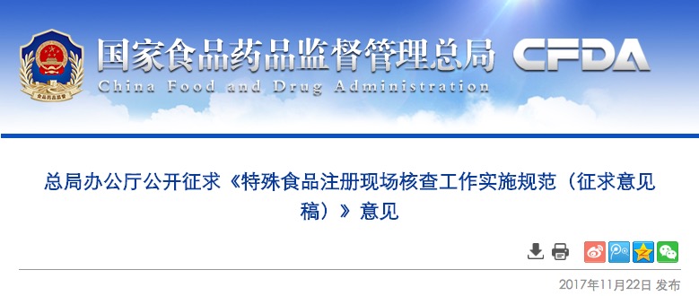為規(guī)范特殊食品注冊(cè)現(xiàn)場(chǎng)核查工作,加強(qiáng)特殊食品注冊(cè)管理,根據(jù)《中華人民共和國(guó)食品安全法》《保健食品注冊(cè)與備案管理辦法》《嬰幼兒配方乳粉品種配方注冊(cè)管理辦法》《特殊醫(yī)學(xué)用途配方食品注冊(cè)管理辦法》等相關(guān)規(guī)定,國(guó)家食品藥品監(jiān)督管理總局起草了《特殊食品注冊(cè)現(xiàn)場(chǎng)核查工作實(shí)施規(guī)范(征求意見(jiàn)稿)》。現(xiàn)向社會(huì)公開(kāi)征求意見(jiàn),請(qǐng)于2017年12月5前將有關(guān)意見(jiàn)和建議以電子郵件形式反饋至國(guó)家食品藥品監(jiān)督管理總局特殊食品注冊(cè)管理司。