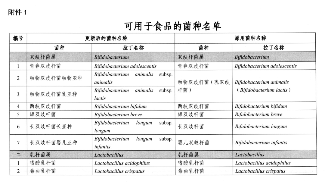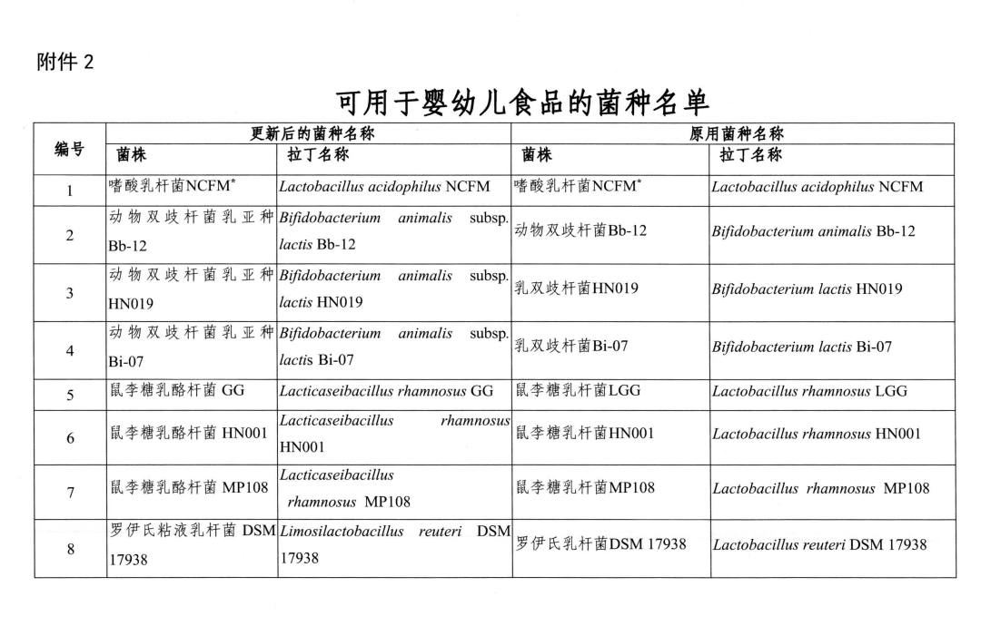 (二)根據(jù)國際有關(guān)菌種分類地位的變化情況,《可用于食品的菌種名單》及《可用于嬰幼兒食品的菌種名單》中12個菌種更新為不同種屬。