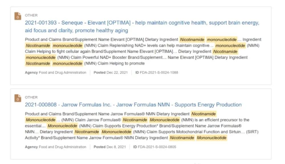 我們也看到了美國上市的NMN產品有很多,這可以從美國FDA關于結構/功能聲稱的申請文件中看出,如下圖所示[7]。