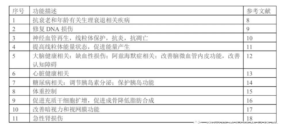 近幾年,有關NMN生物學功能的研究日益增加[8,9-18],如:改善與年齡有關的病理生理和疾病狀況,明顯減輕與年齡相關的生理衰退,改善細胞能量狀態(tài)、神經系統、大腦認知(阿茲海默)等,并對心臟病、糖尿病等諸多疾病情況的改善顯示出良好效果。整理如下表所示。