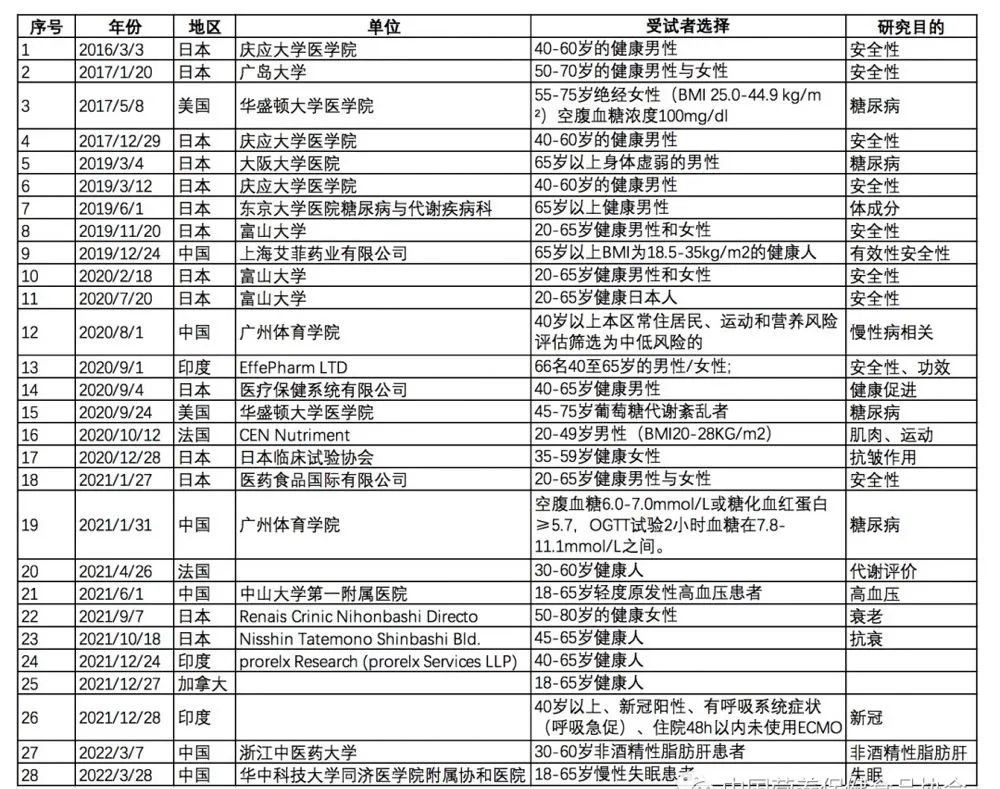 如上面提到,安全性作為食品的重要指標,NR在全球主要國家及地區(qū)已經批準作為食品原料,其安全性已經得到了相關的證明。NMN作為一個新的原料,目前已經被日本批準作為食品原料,在其他主要國家和地區(qū)可以作為膳食補充劑原料,說明其安全性已經得到了一定的驗證。但是對于人體的安全性數據還是比較少的,目前全球范圍內對于NMN的臨床實驗很多涉及到安全性評估和其他相關功能評估。我們整理了目前全球范圍內涉及到NMN的臨床研究,結果如下表所示。