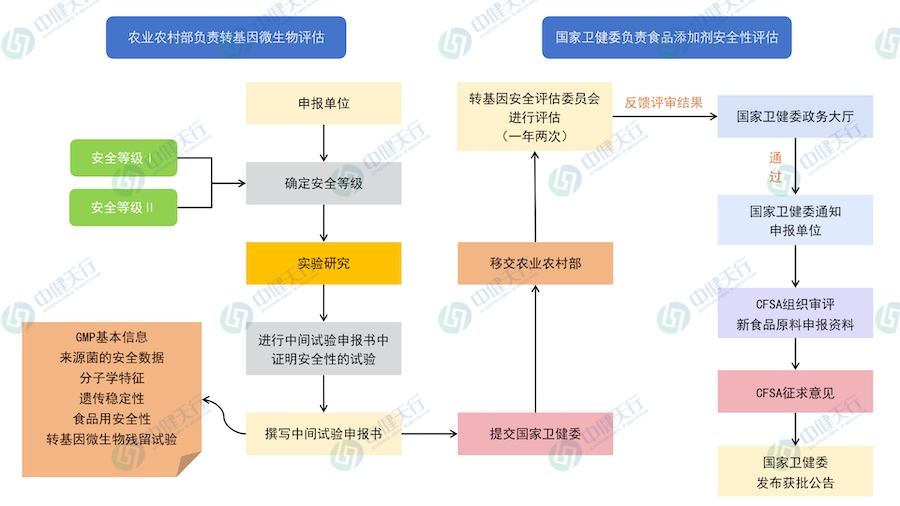 食品添加劑申報(bào)部分按照食品添加劑新品種的相關(guān)規(guī)定進(jìn)行審批與安全性評價(jià),相關(guān)的管理規(guī)定主要包括《食品安全法》、《食品添加劑新品種管理辦法》、《食品添加劑新品種申報(bào)與受理規(guī)定》等,轉(zhuǎn)基因微生物安全評估主要參考《動(dòng)物用轉(zhuǎn)基因微生物安全評價(jià)指南》的相關(guān)規(guī)定,申請人按照上述規(guī)定準(zhǔn)備申報(bào)材料,向國家衛(wèi)生健康委員會提出受理申請,首先由農(nóng)業(yè)農(nóng)村部評價(jià)轉(zhuǎn)基因菌種的安全性,然后由國家衛(wèi)生健康委員會評價(jià)轉(zhuǎn)基因微生物食品添加劑新品種的安全性和工藝必要性。具體申報(bào)流程如下: