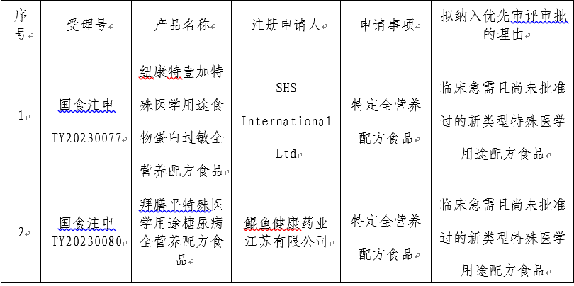 依據(jù)國家市場監(jiān)督管理總局《特殊醫(yī)學(xué)用途配方食品注冊(cè)管理辦法》(國家市場監(jiān)督管理總局令第85號(hào)),我中心對(duì)申請(qǐng)優(yōu)先審評(píng)審批的特殊醫(yī)學(xué)用途配方食品注冊(cè)申請(qǐng)進(jìn)行了審核,現(xiàn)將擬優(yōu)先審評(píng)審批的特殊醫(yī)學(xué)用途配方食品注冊(cè)申請(qǐng)及其申請(qǐng)人予以公示,公示期為5個(gè)工作日。對(duì)公示內(nèi)容有異議的,應(yīng)當(dāng)在公示期內(nèi)向食品審評(píng)中心提交書面意見并說明理由,同時(shí)提交《特殊醫(yī)學(xué)用途配方食品注冊(cè)優(yōu)先審評(píng)審批異議表》(見附件),或?qū)⑸鲜鰞?nèi)容掃描后發(fā)送至電子郵箱:tyyxsp@cfe-samr.org.cn。