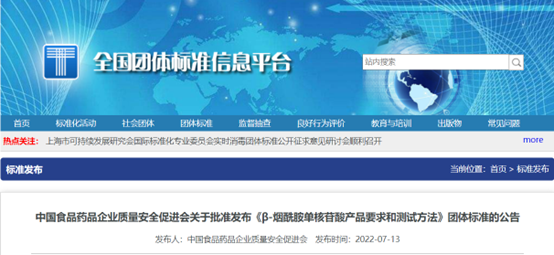 2022年7月13日,中國食品藥品企業(yè)質量安全促進會發(fā)布β-煙酰胺單核苷酸(NMN)產品要求和測試方法團體標準,適用于進出口原料β-煙酰胺單核苷酸產品的質量控制,將于2022年8月12日正式實施。這是國內首個NMN產品標準正式公布,填補了國內空白。